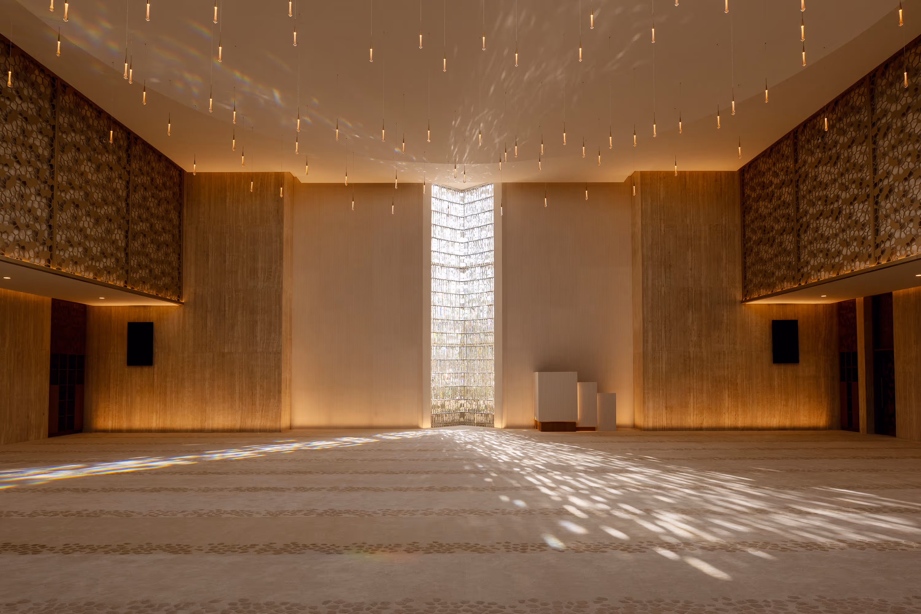 This same mashrabiya pattern is featured in the mosque’s dome and minaret - the dome itself is an open mashrabiya dome, allowing light to filter through the prayer hall rooflight underneath, while the minaret features an open mashrabiya lantern top, illuminated at night as a beacon for night time worshippers.