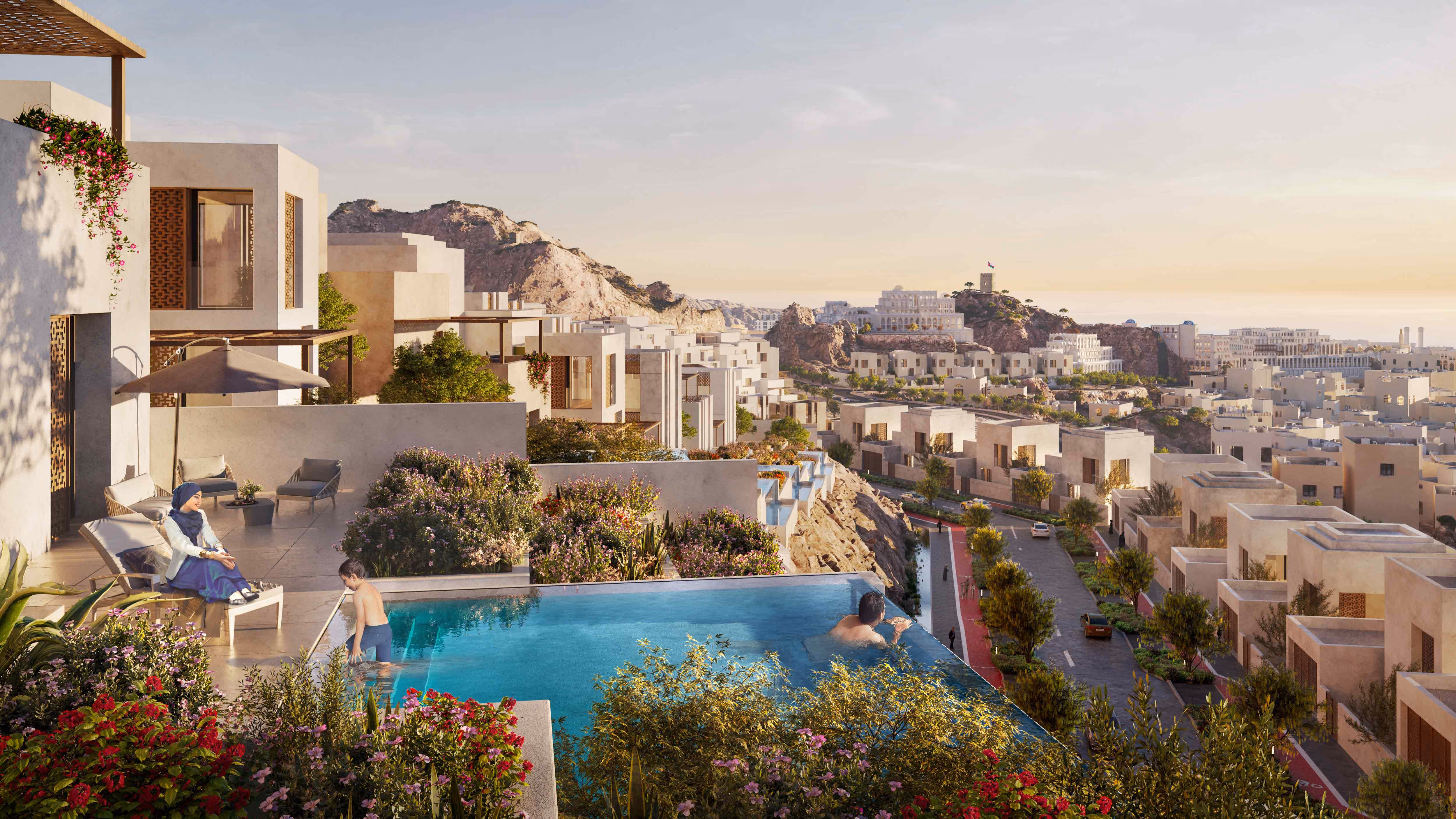Also included are apartments for sale and space for an additional boutique hotel. The souq connects all parts of the layout and provides a shaded pedestrian route and grand arrival spaces. At its centre is a new plaza which forms the heart of the development, enjoying views over the old town past the watch tower of the fort. An outdoor amphitheatre is located here to allow outdoor events and open air cinema in cooler months. It is also envisaged that it could form the venue for weddings under a shaded marquee.